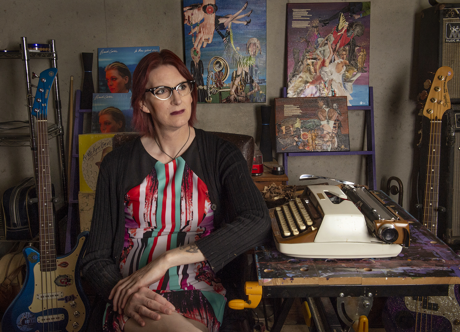 In her basement creative space, Lillian Maisfehlt plays guitar and does collage art.