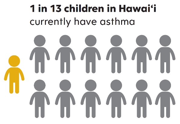 1 in 13 children in Hawai‘i (7.7%) currently have asthma, which is higher than the national average (7.5%). In 2019, approximately 689 emergency department visits and 66 hospitalizations in Hawai‘i were for asthma among children aged 0-4 years.