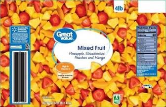 Great Value Mixed Fruit, 64oz (4lb) plastic bag with the following codes: