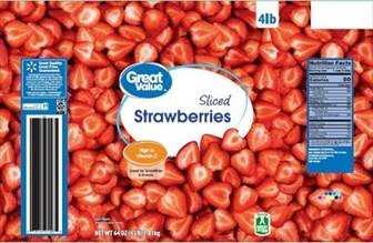 Great Value Sliced Strawberries, 64oz (4lb) plastic bag with the following codes: