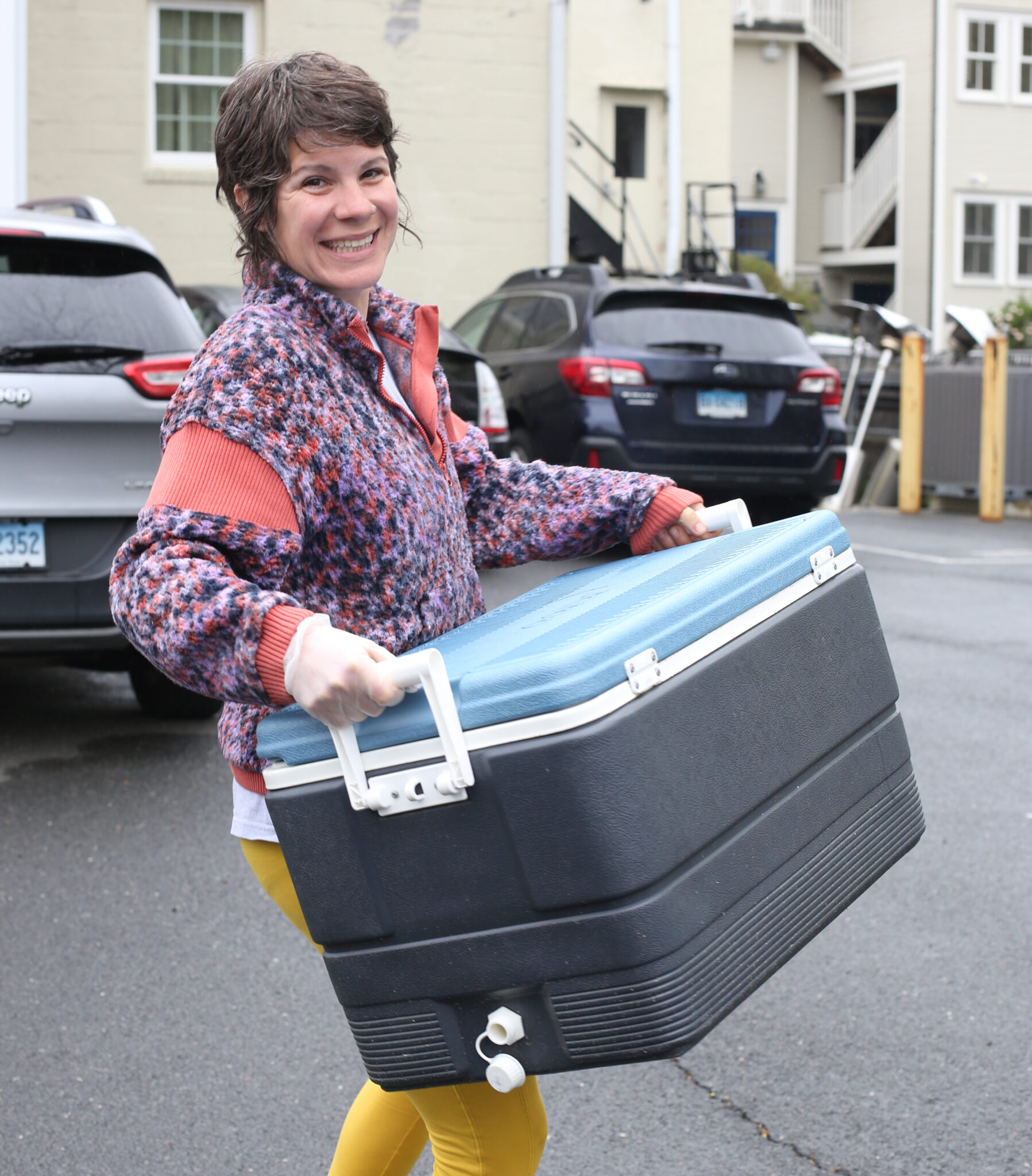 Suzie Flores delivers sugar kelp harvested on her ocean farm near Stonington to a Westport restaurant.