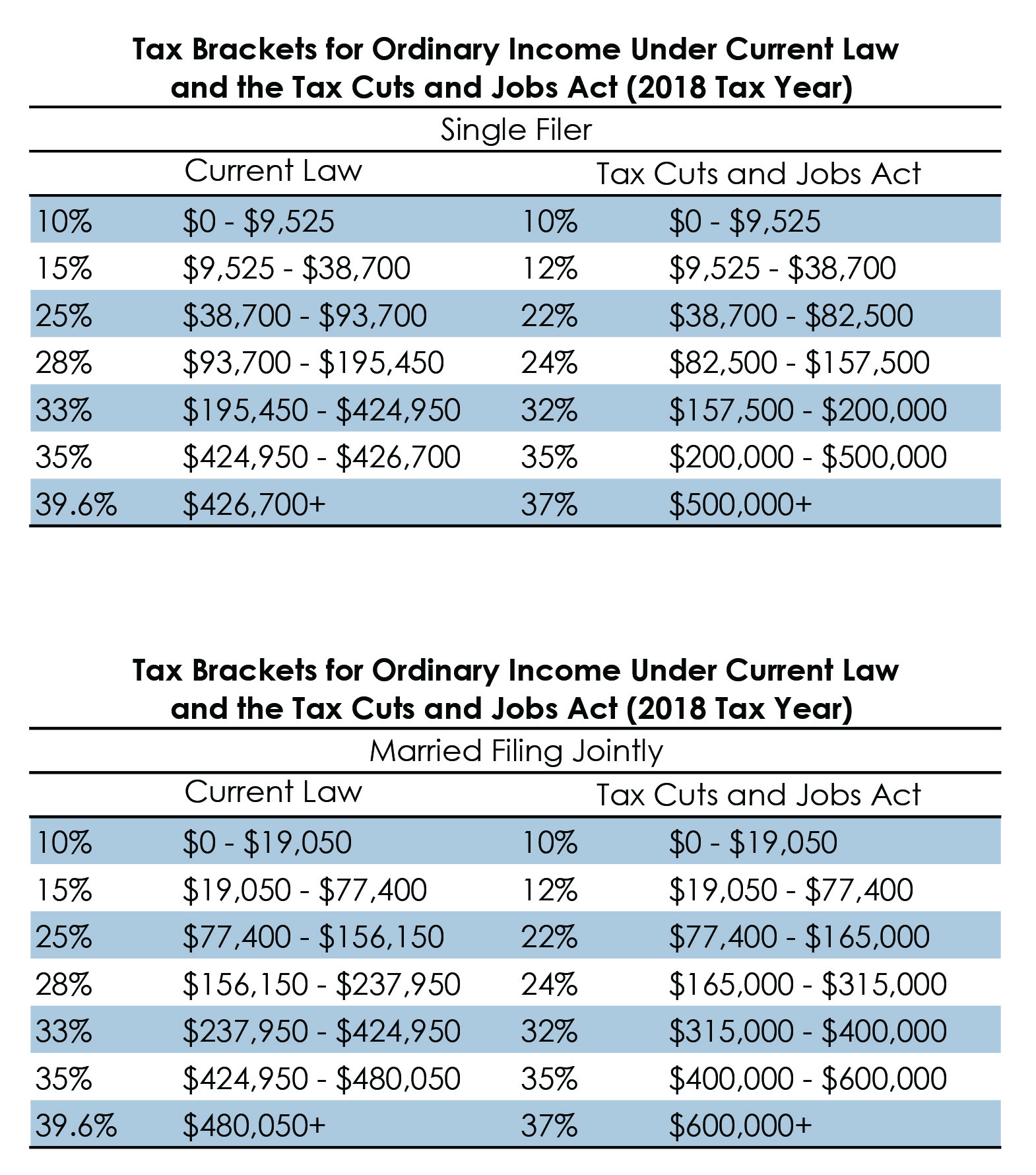 For instance, under the new brackets, the 24 percent bracket extends all the way up to taxable income of $315,000, whereas under the old law, the 25 percent bracket only went up to taxable income of $156,150. For a married filing joint taxpayer with taxable income of $315,000, this results in tax savings of almost $15,000.