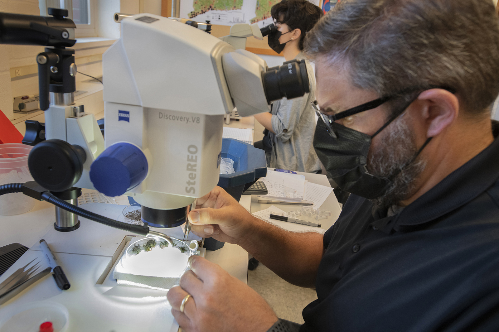 John Shepard (front), assistant scientist, and Catherine Goncalves, laboratory research assistant, sort the various types of mosquitoes collected from traps in the New Haven area. The mosquitoes will then be sent for testing.