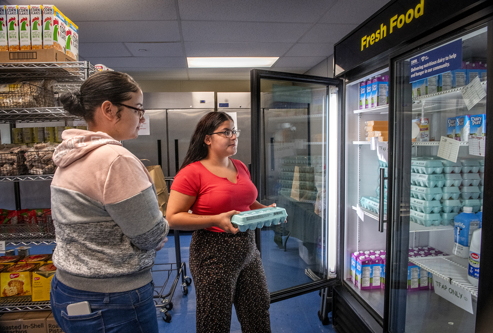 Nachalie Santos looks on as Argueta helps her select perishable items from the food pantry refrigerator. Clients order non-perishables online. When they arrive they may also select from the refrigerated and frozen foods available.
